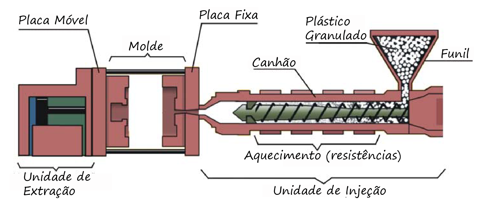 Este processo de derreter o polímero e colocá-lo no molde é feito por maquinas especiais chamadas de Injetoras de Plástico. As injetoras são maquinas sofisticadas que atendem a produção em larga escala de peças de plástico, o mais interessante é que os moldes para injetoras de plástico permitem que a mesma maquina produza diferentes tipos de peças. Troca-se o molde e os polímeros; novas peças começam a ser produzidas. Algumas injetoras são gigantes e produzem peças de carros inteiras, como para-choques e painéis em poucos segundos.